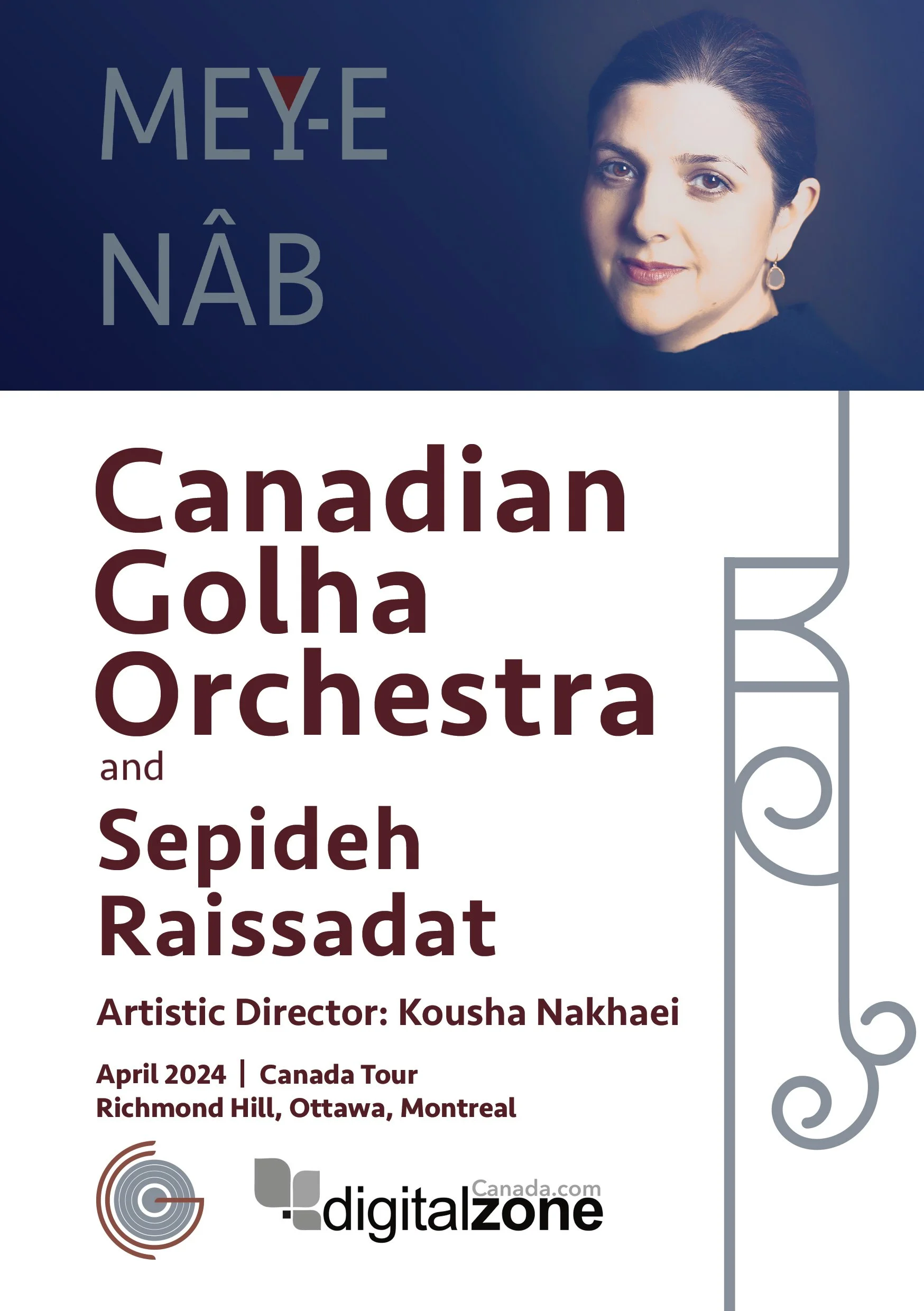 On behalf of everyone at Canadian Golha Orchestra (CGO) and Golha Initiative for Music and Culture (GIMC), we welcome you to our concluding program of the first season. Tonight, we’re thrilled to have Sepideh Raissadat on stage, an internationally renowned singer of Iranian classical music who needs no introduction. Following a successful concert in the Fall of 2023 that focused on Rouhollah Khaleghi’s works, tonight’s program further explores the treasury of the Golha School of music. It features not only masterpieces of the 1950s and 1960s but also a newer composition by Iman Vaziri. We are delighted to present this wide-spanning repertoire to you.